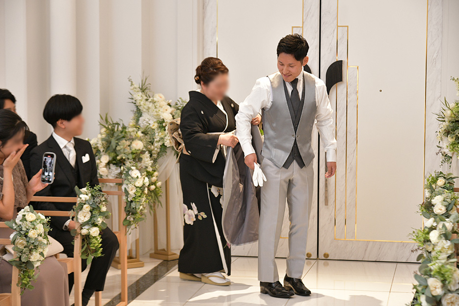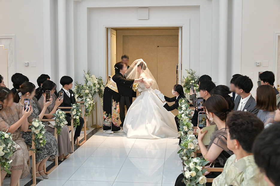 新郎はジャケットセレモニーを、新婦はベールダウンを行い、